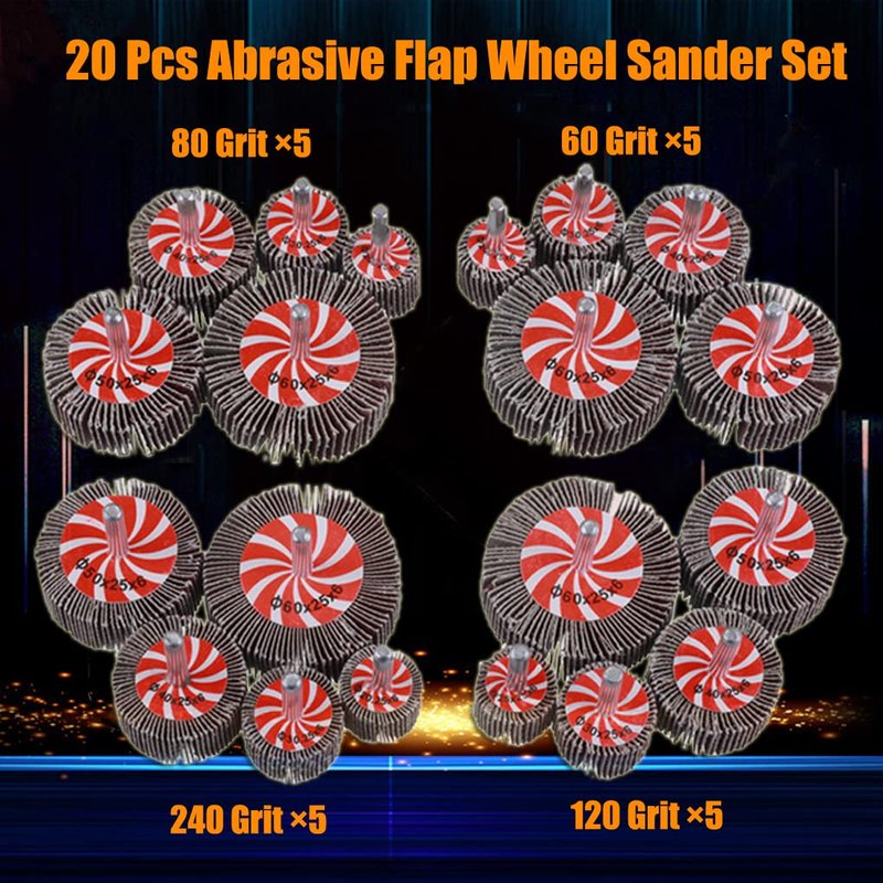 - 【Valued Flap Wheel Set】 Our 20 piece set includes (4) 1” thick sanding wheels with 1/4” shanks in each of the 5 different sizes; 1”, 1.2", 1.58", 2"and 2.36" widths;each size includes 60 grit, 80 grit, 120 grit and 240 grit.