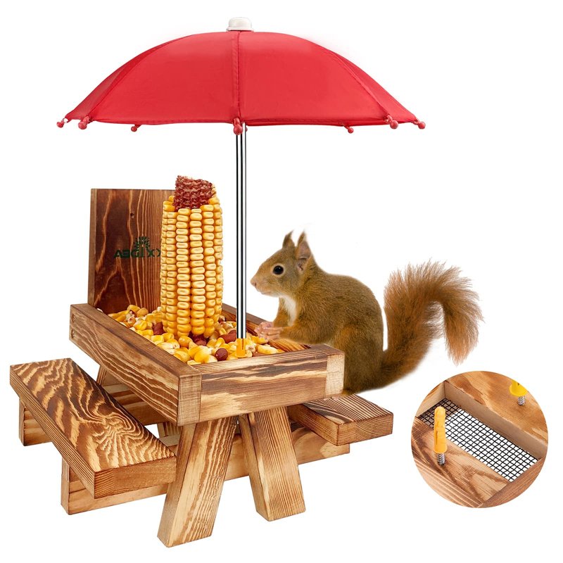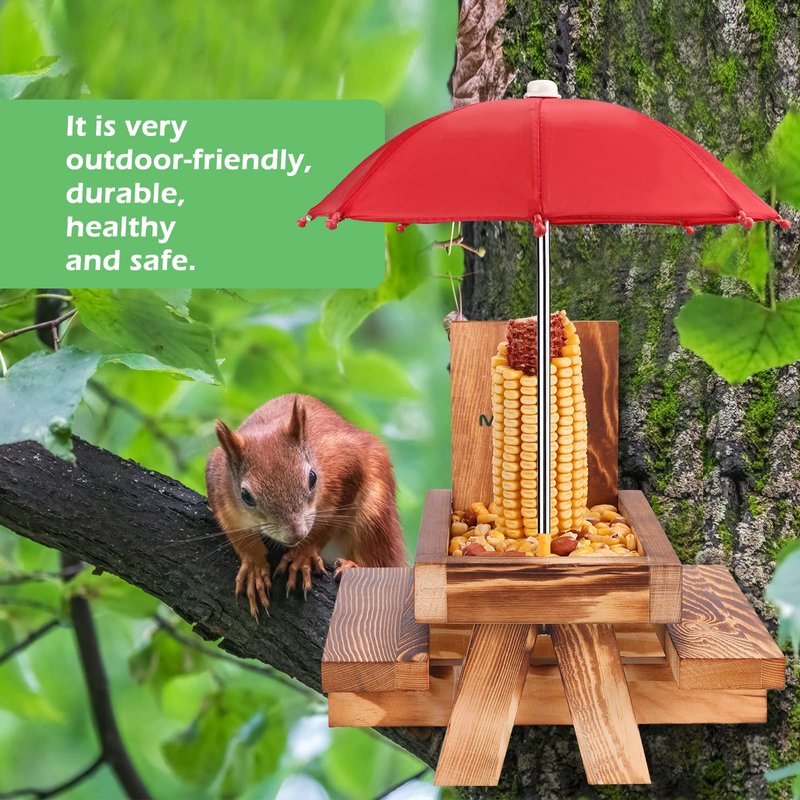 - 🐿SQUIRREL FEEDER TABLE WITH UMBRELLA: Our squirrel feeders for outside are equipped with a small 10.6-inch umbrella, which can not only attract squirrels quickly, but also shade the squirrels in sunny or rainy days, so that they can eat more safely.