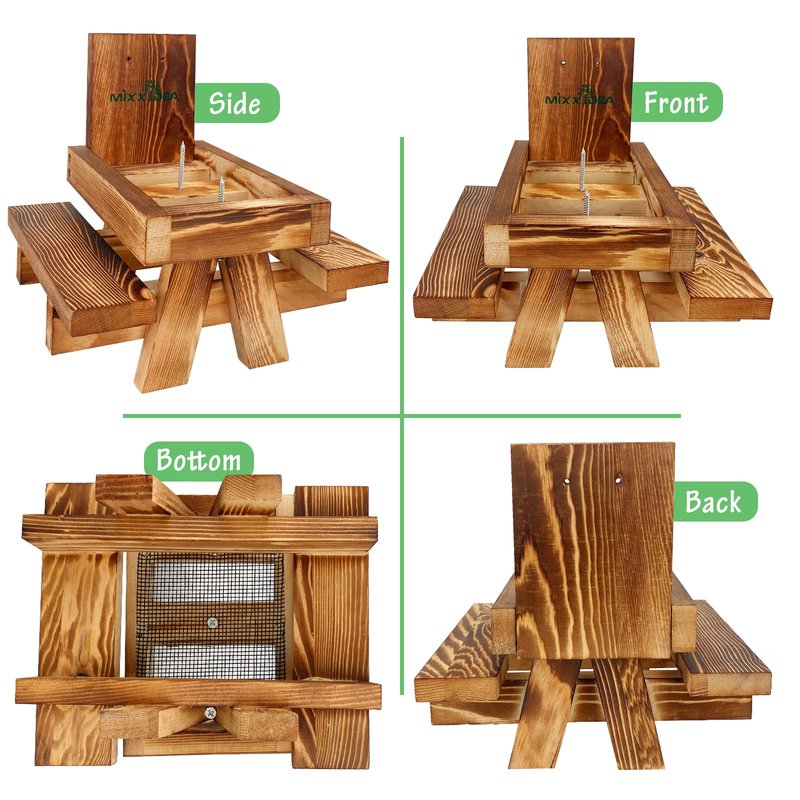 - 🐿UNIQUE DESIGN SQUIRREL PICNIC TABLE: Different from other squirrel feeding tables, our chipmunk feeder station bottom is a layer of iron mesh, even in rainy days, our squirrel picnic table will not accumulate water, which can facilitate the animals to eat more healthily.