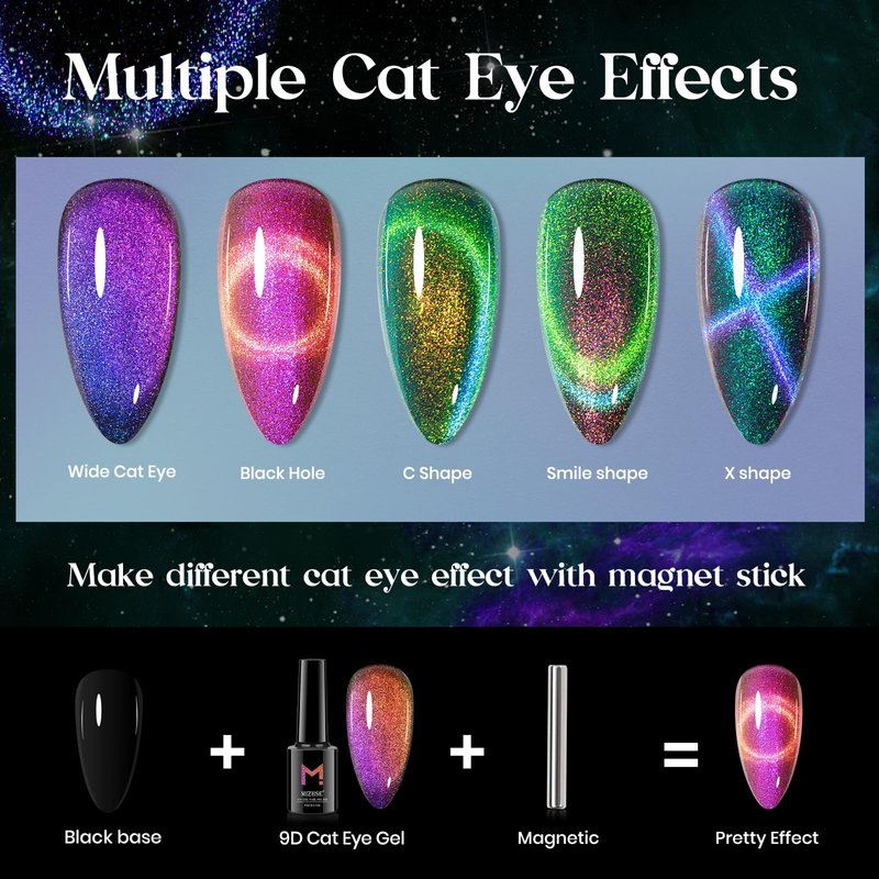 - WARM TIPS: Please do skin test and read directions carefully before use. Avoid contacting with eyes,mouth or skin. Enjoy professional-level nail art & care with MIZHSE's Cat eye gel and click "Add to Cart" now