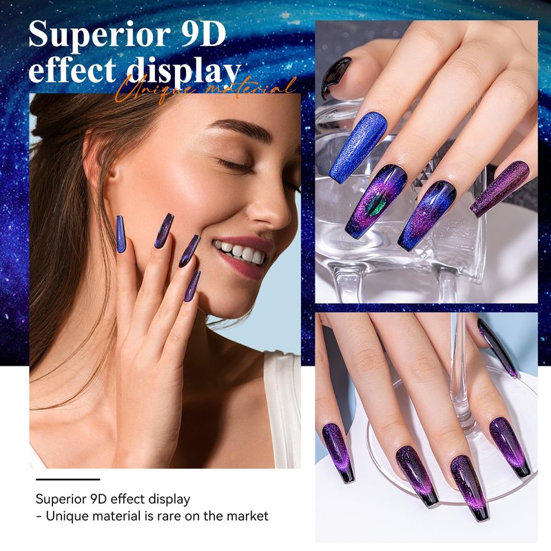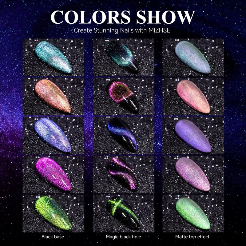 - Charming Effect of Cat Eye Gel Nail Polish: Chameleon color with cat eye effect and holographic shimmer with galaxy effect. Tips: Mix Our magnetic nail polish gel color, and you will get amazing results! Attractive color changing and cat eye effect will surprise you. Different effects depend on different lights and angles!