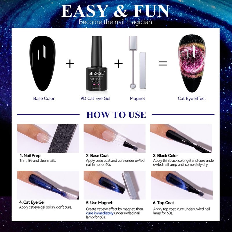 - MIZHSE 9D Cat Eye Gel Nail Polish Kit: 5 x 10 ml magnetic gel polish collection set, 1 black gel polish, 2 magnetic sticks. Cure under UV/LED nail dryer lamp. All in 1 kit, save your money and time to nail salon! Professional cat eye gel for infinite styles. Suitable for natural nails, UV gel nails, false nails, acrylic nails, etc. Please refer to our videos for more detailed operations. If there is any doubt in the operation, please feel free to contact us!