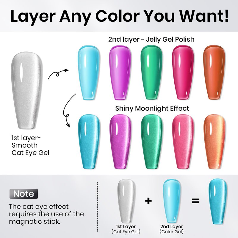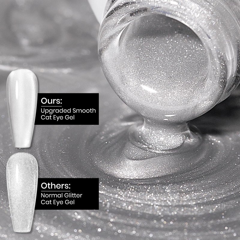 - Silver Cat Eye Gel Nail Polish: This mooncat cat eye gel polish can match with any color gel, you can create your own color. And you can apply 1-2 layers of jelly gel polish to achieve other color effects of moonlight cat eye