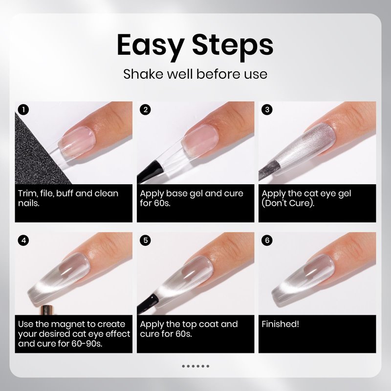 - Healthy Formula: Made from 11 toxin-free ingredients resin and low smell. We choose salon quality magnetic particles, which are more delicate and can be easily create a more obvious and shiny cat eye effect. Requires 90-120s of nail lamp