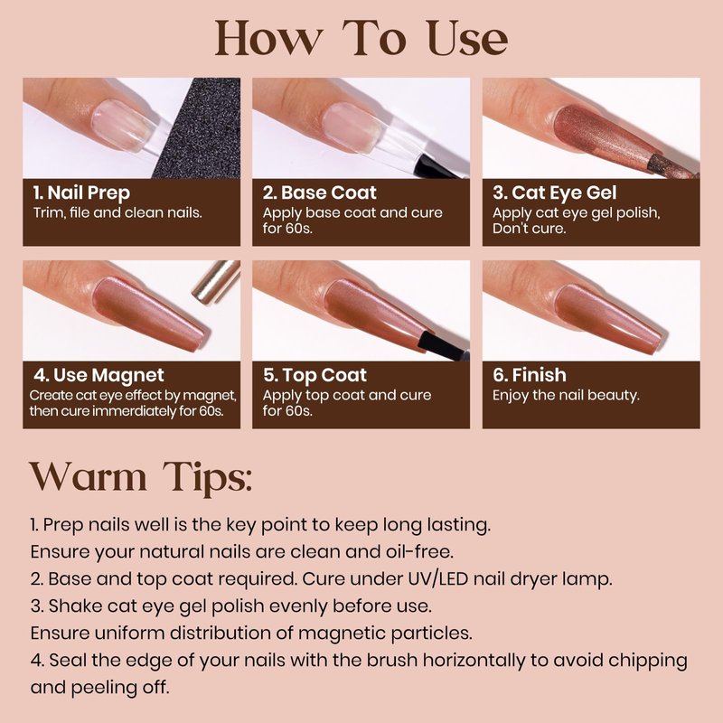 - 【Warm Tips of Magnetic Gel Polish】Base and top coat required. Use the magnet to create desired cat eye effect before curing. Make sure that each layer is thin and completely dry. Please read directions carefully before application. Enjoy professional-level nail art & care with MIZHSE's gel polish and click "Add to Cart" now.