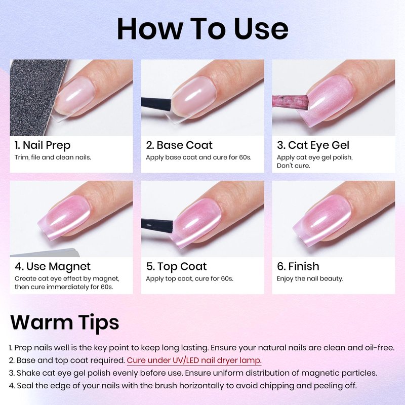 • ✨【Warm Tips of Magnetic Gel Polish】Base and top coat required. Use the magnet to create the desired pattern before curing. Make sure that each layer is thin and completely dry. Please read the directions carefully before applying. Please contact us directly if you have any problems while using it. We always keep active to help you. Enjoy professional-level nail art & care with MIZHSE's gel polish and click "Add to Cart" now.