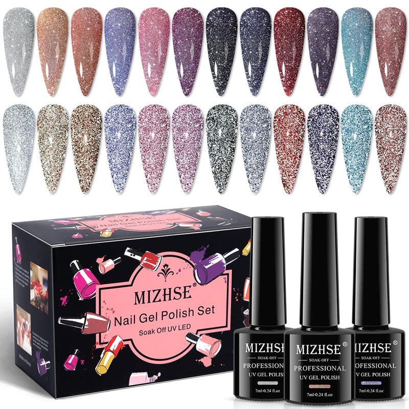 MIZHSE Reflective Diamond Gel Nail Polish Kit 12 Pcs, Colorful Sparkly Soak Off UV LED Gel Polish 7ml
