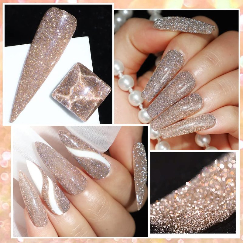 - Special Reflective Glitter: 10 ml gold glitter gel polish. It is highly pigmented colorful reflective glitter, not like other glitters gel nail polish in the market which are just strips.