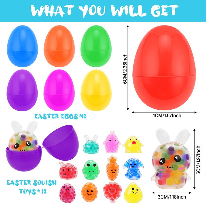 - Great Easter Basket Stuffers: Package Includes 12 Different Cute Easter Themed Squishy Toys Pre Filled in 12 Plastic Easter Eggs(1.57inch*2.36Inch). Easter Basket Stuffers, Easter Basket Fillers, Easter Gifts, Party Favors, Birthday Gifts, School Classroom Rewards, Carnival Prizes, Pinata and Goodie Bags.