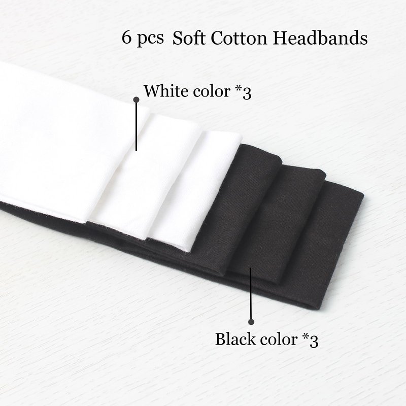 Total 6 pcs solid color cotton headband in package Product Specifications: Headband style: cotton stretch non-slip headbands Headband color: black color*3 , white color*3 Headband material: Sweat absorption, skin-friendly, highly stretchable, breathable, lightweight, and quick-drying. Not easy to deform. Headband size: width: 2.75 inches (7cm), unstretched length: 8 inches (21cm), can be stretched to 12 inches. One size fits most people, small size head, medium size head, large size head. you can wear them for long periods of time. Product Features: cotton hairband evaporates sweat fast, keep your forehead dry, and keeps your hair off your face. it is also a stylish hairband for your hair. Soft, Machine washable, thick, soft touched, double layer, sewing inside, non-slip, stays on your head. High-quality cloth headbands, keep sweat out of my eyes, are comfortable to wear, Great hold on thick hair or thin hair. Can be worn on any occasion in the whole year, and fits most outfits. Widely used: wash face, put on makeup, use a face mask, make quick and easy hairstyles, work out, hiking, running, fitness, gym, volleyball, softball, baseball.