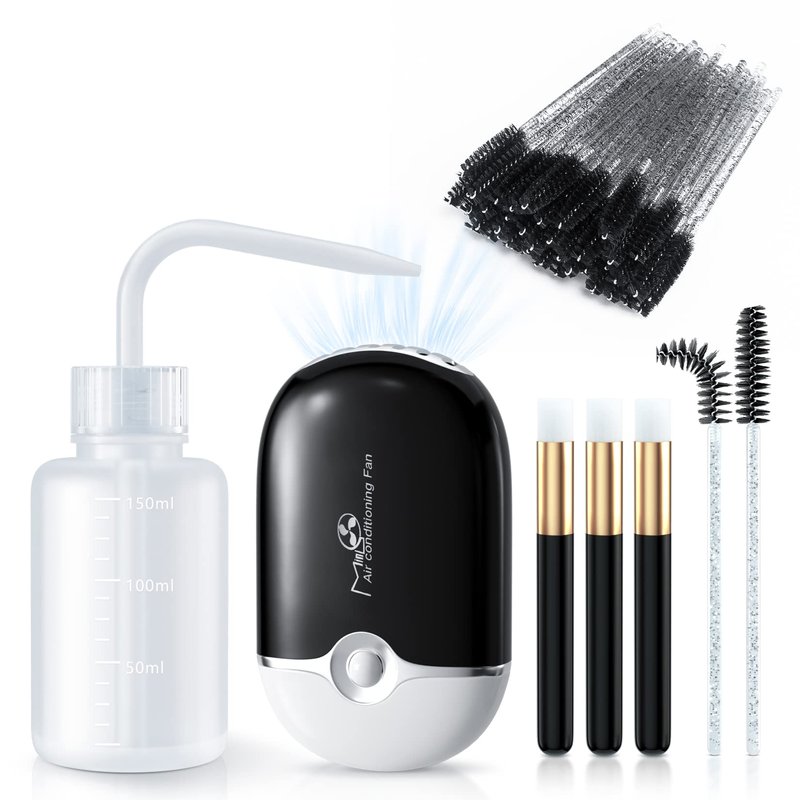 mlogiroa Lash Eyelash Fan Kit for Lash Extension Mini Portable Fans with 50 Lash Shampoo Brush 3 Nose Blackhead Facial Cleaning Brush 1 Plastic Wash Bottle(Black)