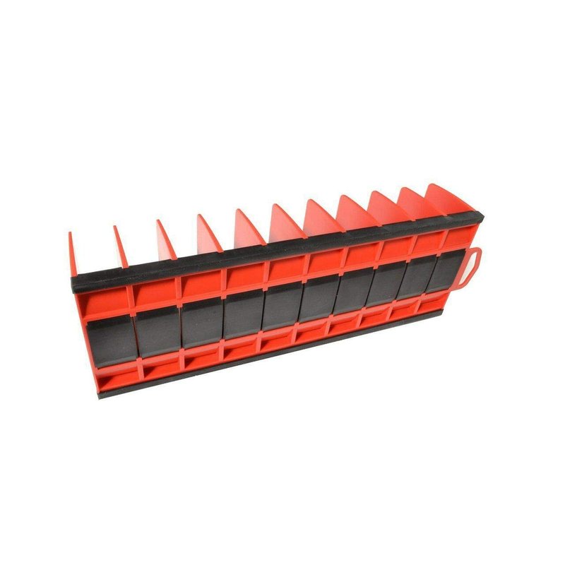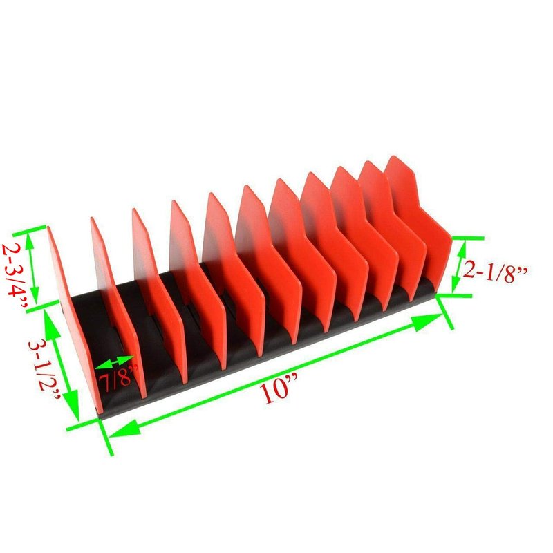 Maximize your storage by organizing pliers upright in toolbox drawers! The premium rubber base on this rack grips tools and the drawer to keep it all in place. With 7/8” wide slots, it accommodates a wide variety of tools holding a total of 10, even the spring opened pliers and ones with insulated handles. It provides you immediate recognition of missing tools and it is fuel & solvent resistant.