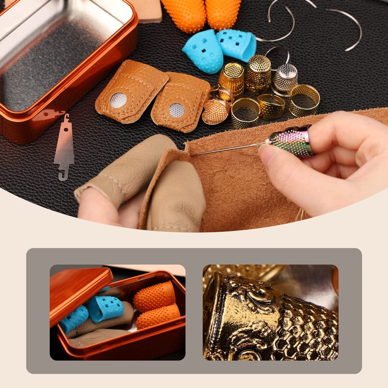 - Five types sewing thimbles: 9 pcs in total, adjustable, sturdy leather thimbles.You can use them for different sewing projects. Sewing thimble finger protector is made of sturdy and durable copper material, which is not easy to rust or break. Thimble finger protector will be an indispensable helper in your sewing work. And to help you better complete needlework, sewing, embroidery and other work.