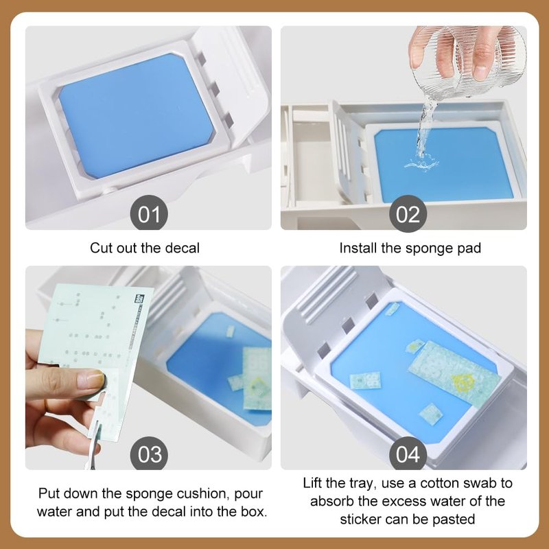 - How to use: install the sponge, add water to the tray, cut the decal you want to stick, put it into the water for about 15s, lift up the sponge, drain the excess water, and use tweezers to work on Gundam model decals