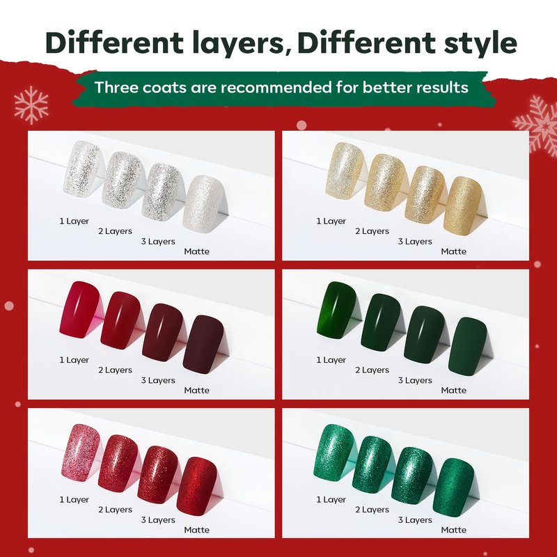 - Environmental & Healthy: The 6pcs christmas red set nail polish colors are made from 6 Toxin Free Ingredient which makes it safe and has low odor. No harsh ingredients or adhesives that lead to damaged nails.