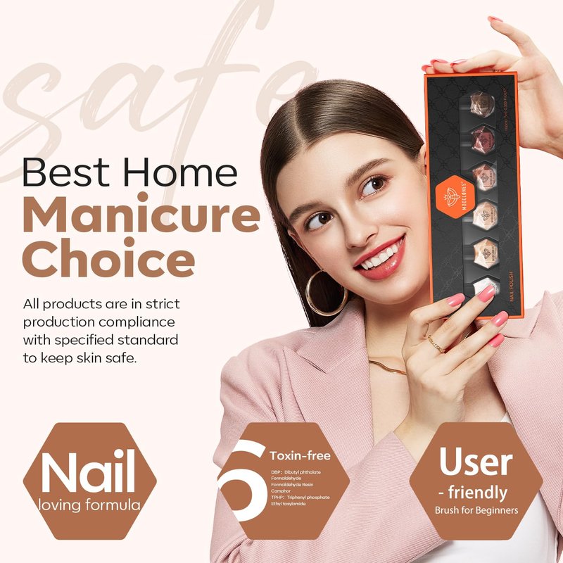 - [Environmental & Healthy] The 6 PCS brown nude nail polish set is formulated with 6 toxin-free ingredients, ensuring safety and minimal odor. It contains no harsh chemicals or adhesives that may damage nails.