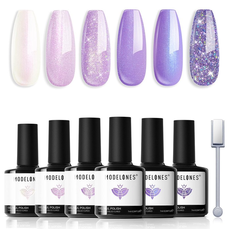 - 💜【2024 Purple Glitter Limited Edition Gel Polish】This Purple Glitter Gel Nail Polish Set includes 6*7ML( 0.24fl oz) gel polish + 1*Magnetic Stick. Modelones well-selected 6 gorgeous shades of the most iconic and trendsetting all-new colors. Flawless coverage these sparkle gel nail polish and your nail would look brilliant shine finish and more attractive. Can get cat eye effect with 2340.
