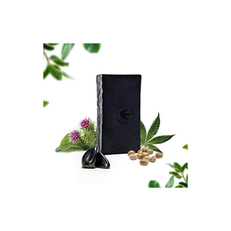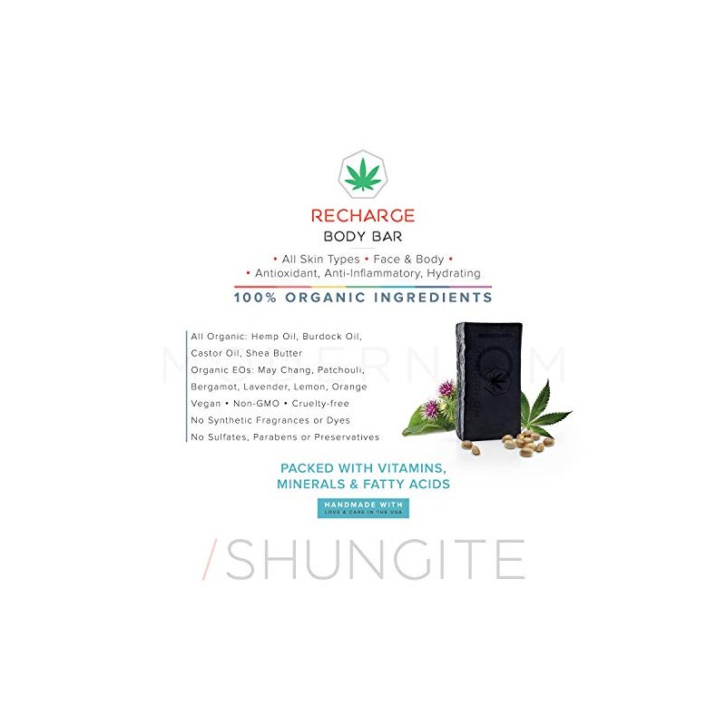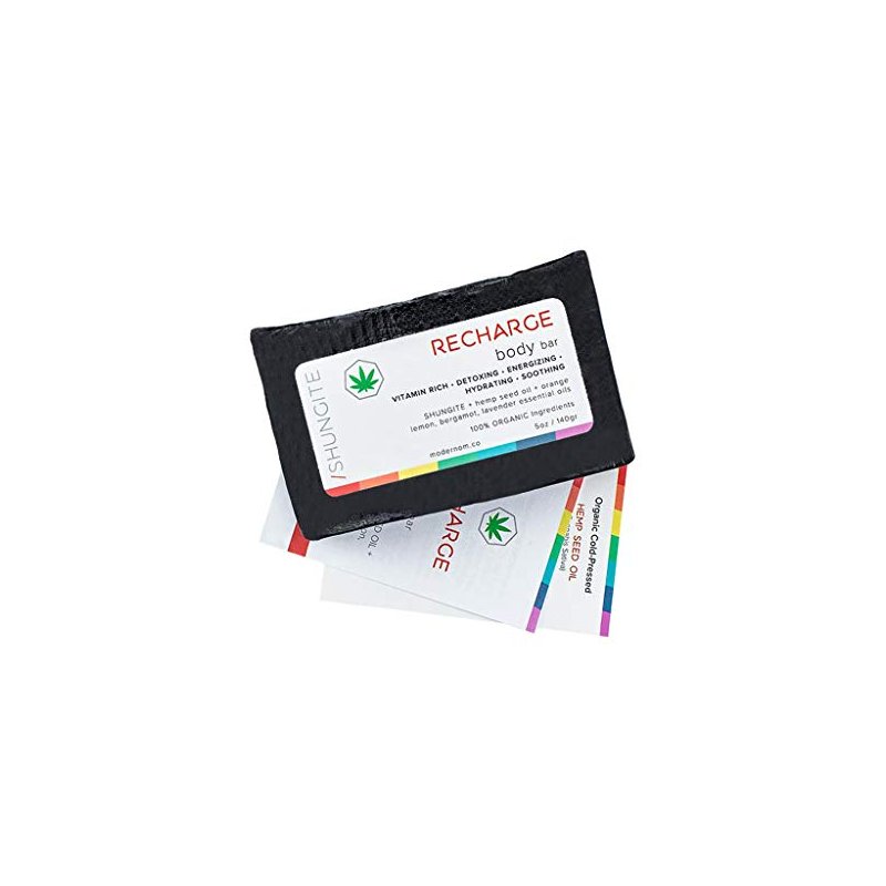 RECHARGE Bar Soap with Shungite and Organic Hemp Oil by Modern OM Everyday Organic Body Care for the Mindful Recharge your body with Shungite and Hemp Seed Oil in our unique bar soap made with Organic Ingredients. This energizing, mood-uplifting, moisturizing soap is perfect for all skin types. With a calming, light citrusy aroma, it is perfect for daily use! Packaged in our Modern Om burlap bag and ready to make someone's day. Purifying, Detoxifying, Hydrating - Great for Hands, Face and Body!Energizing and Relaxing Body Care for all Ages!ABOUT MODERN ŌM: In naming our company after ŌM, a 3,000-year-old symbol, we open a vital conversation on what it means to be mindful in the modern world. We strive to be a brand for mindful humans and build a community of people who seek a more peaceful, happy and conscious lifestyle.