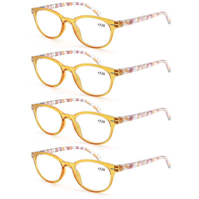 - [Package/Design]Inculding 4 pair plastic frame women glasses for reading ,4 pouch and 1 cloth. Colorful frame with Pattern temple.round women reading glasses have purple/pink/yellow/blue colors.