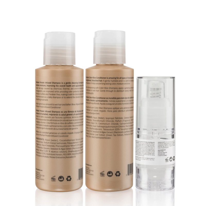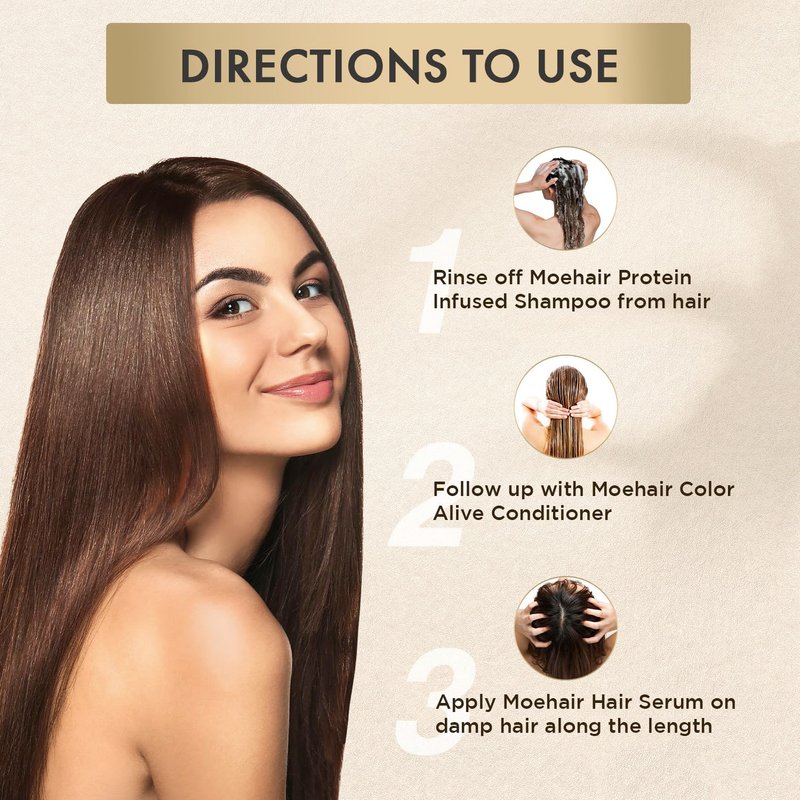 MOEHAIR Travel Pack of Protein Infused Shampoo (3.4 Fl. Oz), Color Alive Conditioner (3.4 Fl. Oz) and Hair Serum (0.51 Fl. Oz) | Travel Shampoo and Conditioner with Frizz Ease Serum | Sulfate-Free