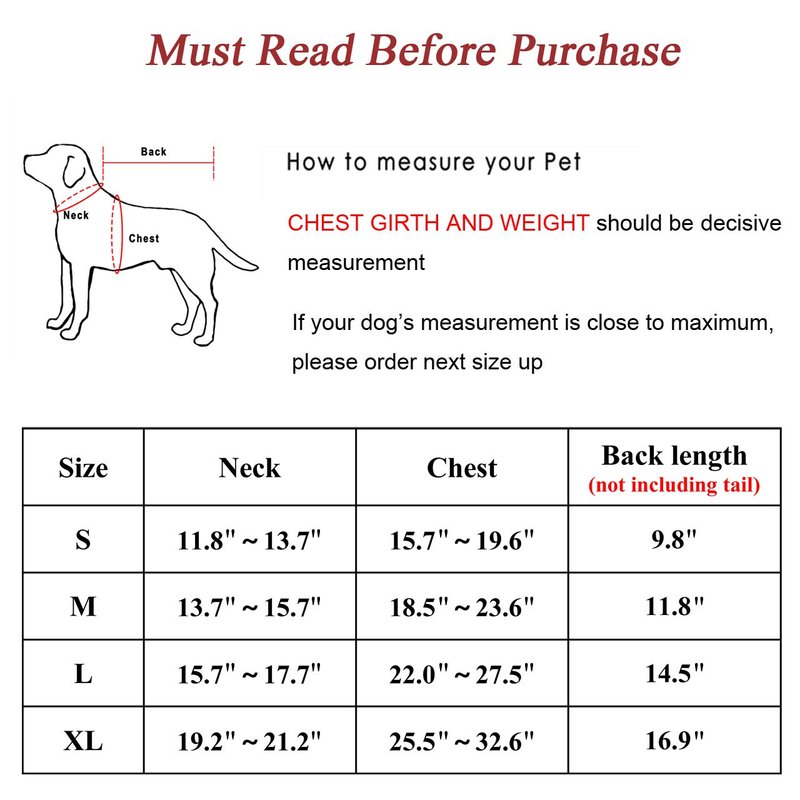 - Size L: 15.7"~17.7" neck girth; 22.0"~27.5" chest girth; 14.5" back length(not including tail), must measure your pet's neck/chest girth,back length first and check the size chart before order, do not make a decision just by the size name, a bit loosely will be more comfortale