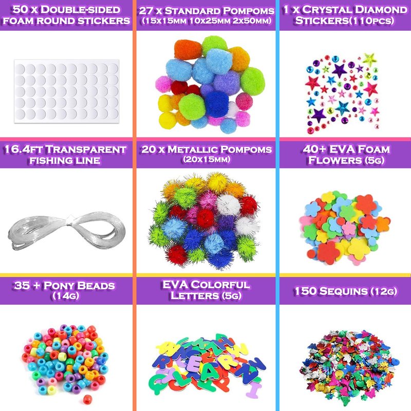 - ✨FUN AND COLORFUL PIECES: Items include colorful pipe cleaners, pompoms, fun shaped sequins, googly eyes, foam letters, flowers, plastic beads, wooden sticks, paper scroll, 5 sticks of glue, plastic safety scissors, acrylic sparkly diamonds and a plastic storage bottle,etc.