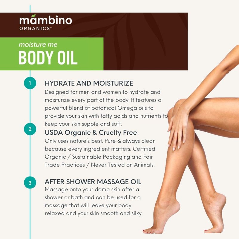 - MOISTURIZING BODY OIL: Moisture Me Nourishing Body Oil is designed for men and women to hydrate and moisturize every part of the body. It features a powerful blend of botanical Omega oils to provide your skin with fatty acids and nutrients to keep your skin supple and soft.