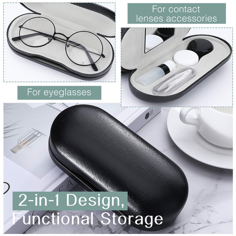 - 2 IN 1 DOUBLE DESIGN: Features with 2 in 1 design (two sides in one case), one for the eyeglasses,the other for contact lenses and its accessories. Perfect for storing reading eyeglasses and sunglasses. Great for travel and bussiness travel, easy and convenient access to yor eyeglasses.