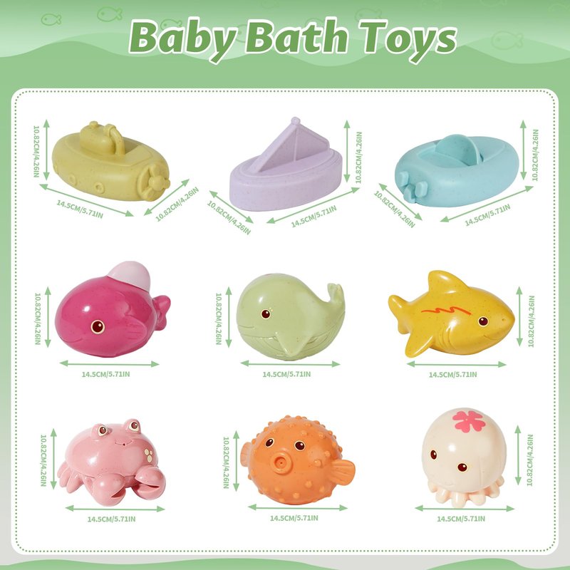 Our bath toys - designed specifically to bring endless fun and enjoyment to your child during bathing! There are various shapes, sizes, and bright colors that attract children of different ages and preferences. From cute animals and marine creatures to interactive floating toys, everyone has something that suits them. These toys not only provide entertainment, but also stimulate children's imagination, encouraging them to engage in imaginative role-playing and creative storytelling. Made of food-grade wheat straw material, it can withstand repeated use and ensure long-term durability. They are also designed with smooth edges to ensure gentle interaction and no any potential discomfort or harm to delicate skin.