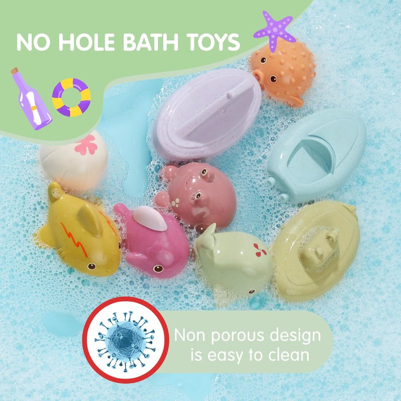 - No Hole Bath Toys - A set of 9 baby bath toys bath toys Including Sharks, Whale, Fish, Crabs, Pufferfish, Octopus, Speedboat, Sailboat and Submarines,features a seal design that won't pool water! the bathtub toys are easy to clean and simply rinse with water and air dry after each use.