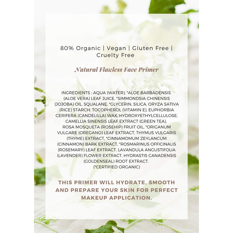 Our natural face primer is 80% organic, made with all natural ingredients, Vegan, Gluten Free, Non GMO and never tested on animals.