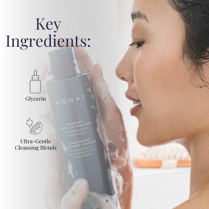 Indulge in the luxury of MONAT Soothing Micellar Shampoo, your solution to gently yet effectively cleansing delicate tresses and soothing sensitive scalps. Our innovative formula, powered by micellar technology, attracts, captures, and removes dirt, impurities, and buildup without causing irritation or stripping your hair of its vital nutrients and moisture. Perfect for those with fine, delicate hair or a sensitive scalp, our shampoo promises a blissful cleaning experience. Formulated with glycerin and an ultra-gentle cleansing blend, it ensures your hair retains its natural hydration and essential nutrients, leaving it feeling refreshed, clean, and soft. Our commitment to sustainability is evident in our packaging, utilizing 100% post-consumer recycled materials to reduce environmental impact. To use, simply emulsify in your hands, apply to wet hair, and leave on for 2-3 minutes before rinsing. For optimal hair health, follow with your favorite MONAT conditioner. Experience the soothing, refreshing cleanse your hair deserves with MONAT Soothing Micellar Shampoo.