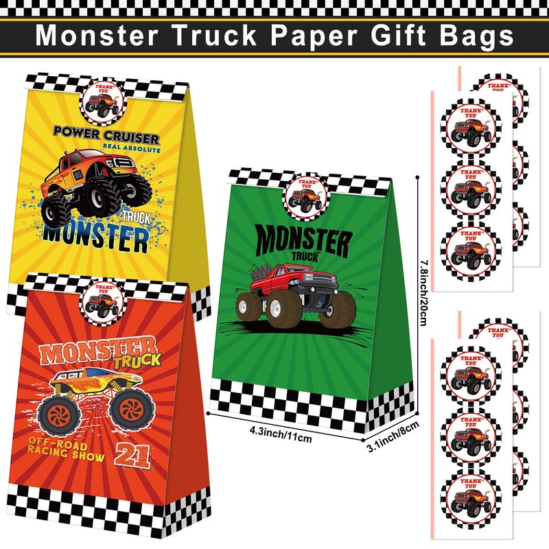 - PACKAGE INCLUDE - Monster Truck Party Favor Set includes 12 PCS Truck Theme Slap Bracelet, 12 PCS Truck Keychains, 12 PCS Tattoo Stickers, 12 PCS DIY Stickers, 12 PCS Truck Straws and 12 PCS Truck Party Gift Bags.