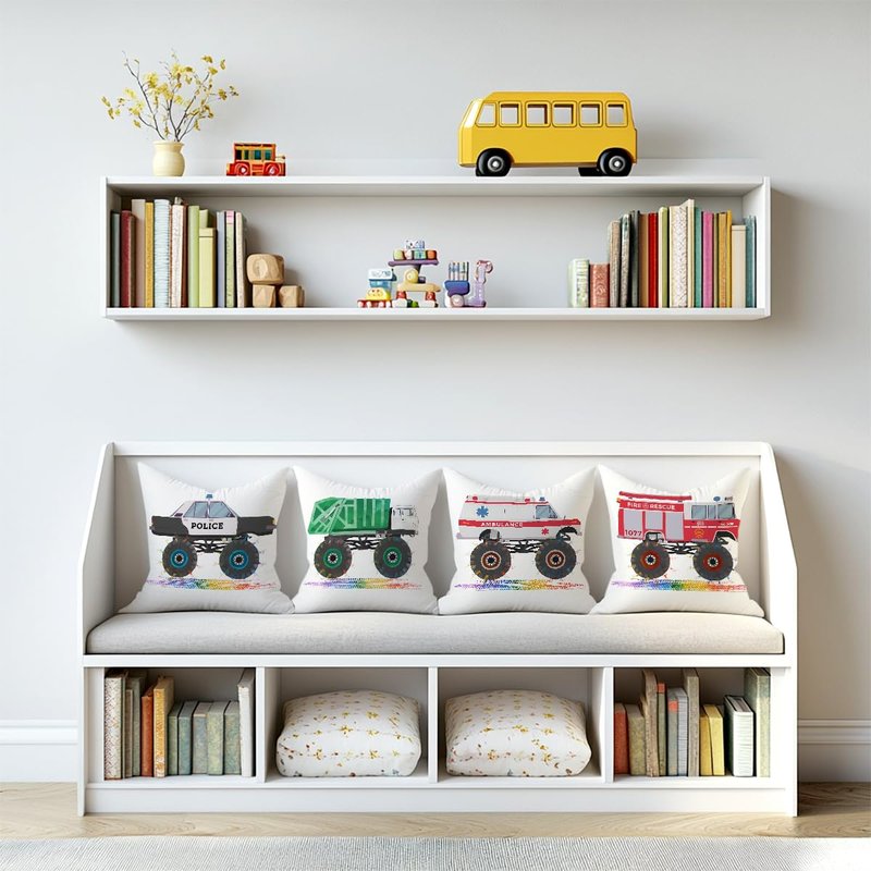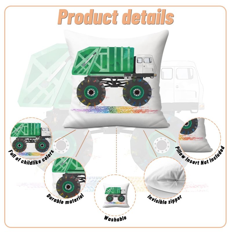 Monster Trucks Pillow Covers, Throw Pillow Covers 18x18, Pack of 4 Zipper Pillow Cases, Firetruck Garbage Truck Ambulance Police Car Pillow Protectors, Bed Playroom Nursery Boys Room Decor Pillowcase