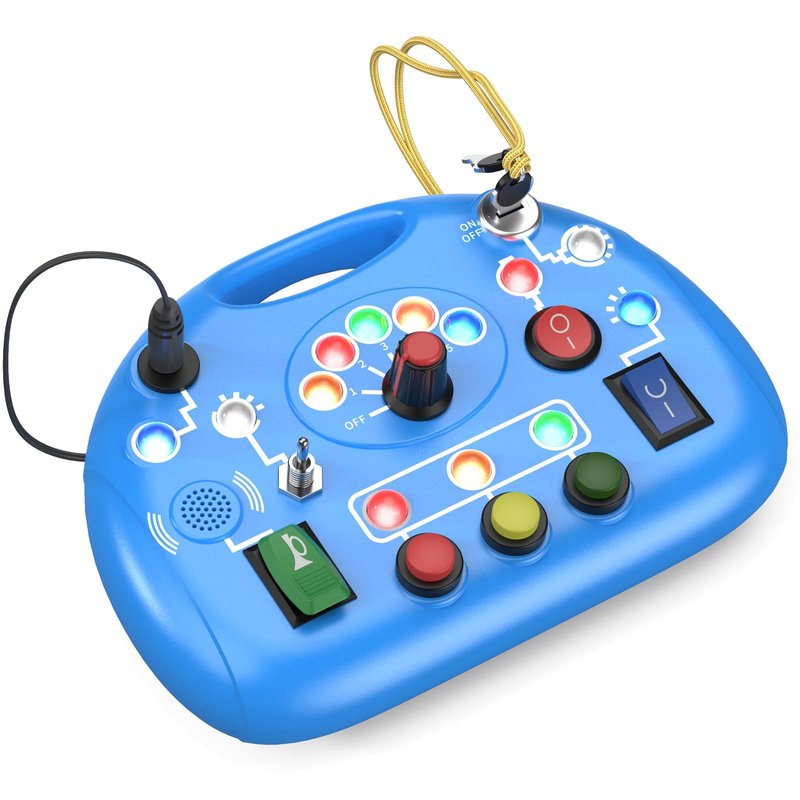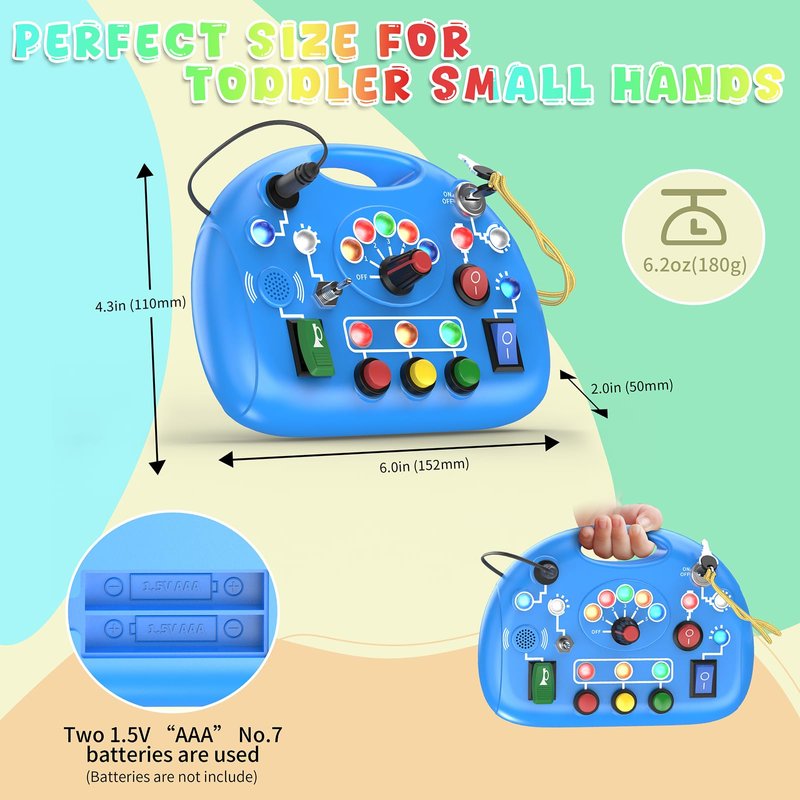 - Sensory Learning Toy: The key must be turn on, then each switches will be works, the toddler busy board with13 led lights and 8 color stimulation, 10 Switch Settings and a "bibibi..." horn, This kids sensory board has buttons to push, toggles to flip, and dials to turn, Each switch and button on the switch busy board corresponds to a real-life situation, providing sensory experiences that keep your toddler engaged and curious. Please prepare two AAA batteries before use.