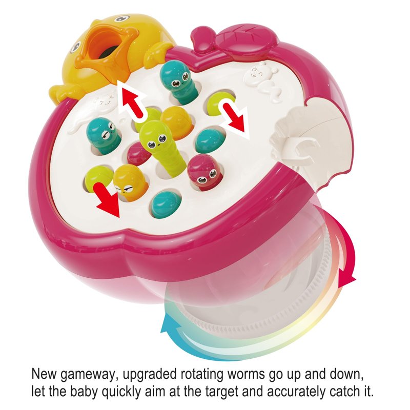 The Guardian Apple Toy comes with 5 different colored bug shaped blocks that can be magnetized by the mommy bird shaped hammers to mimic a mommy bird feeding into a baby bird's beak. The apple contains a variety of surprises that baby will love, including fun music and cute little bugs. When the toy plays music, the base of the apple rotates, driving the bugs up and down, emerging for easy catching and more tantalizing fun! For early learning, Guardian Apple Toys are ideal for helping baby with hand-eye coordination and musical initiation. They can promote spatial development by using the mimicking bird to catch bugs for feeding. When your child is ready for the next level of challenge, turn on the fast play mode. It's been said that movement in early childhood is the best way to increase IQ, and your child can begin fine motor learning with the Guardian Apple Toy. It features both slow and fast modes to help your child's hand-brain-eye combination develop holistically! Guardian Apple Toy toys are engaging, educational and fun. Help your child stimulate their imagination and learn through play. (Requires 4 AA batteries). The entire product is made of rounded ABS material and pastel colors and is recommended for children1 2 3 ears old .