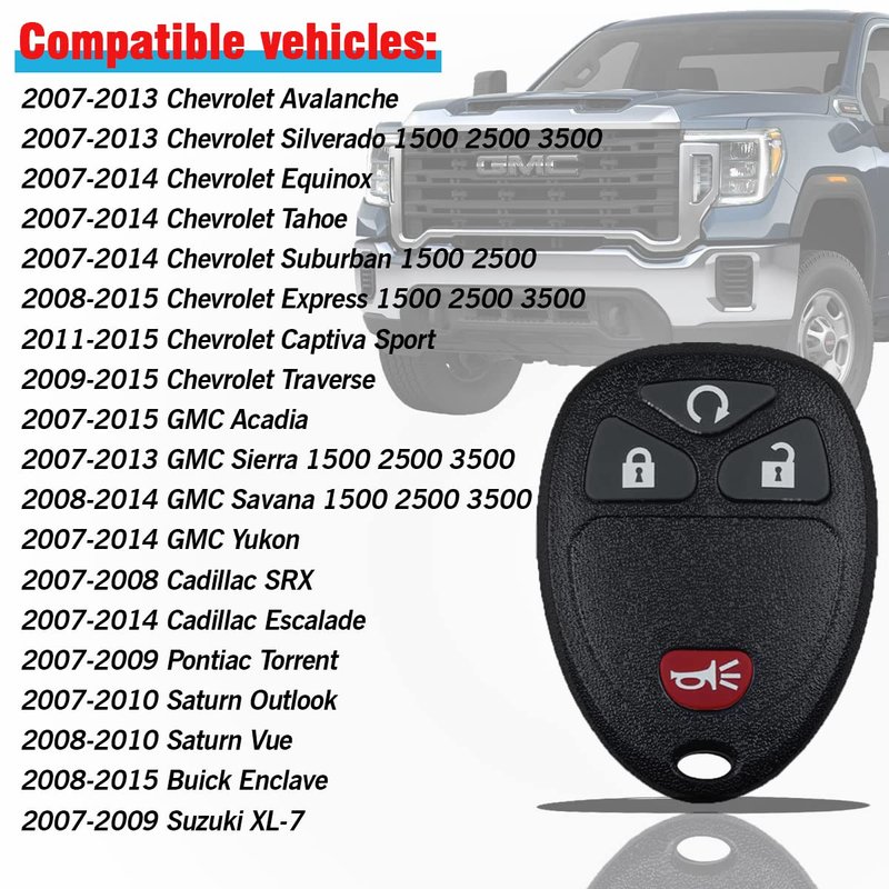 - COMPATIBILITY - Keyless entry remote compatible with GMC 2007-2016 Acadia/2008-2015 Savana/2007-2013 Sierra/2007-2014 Yukon, Chevrolet 2007-2013 Avalanche/2008-2015 Captiva Sport/2007-2014 Equinox/2008-2015 Express/2007-2013 Chevy Silverado/2007-2014 Suburban/2007-2014 Tahoe/2009-2016 Traverse