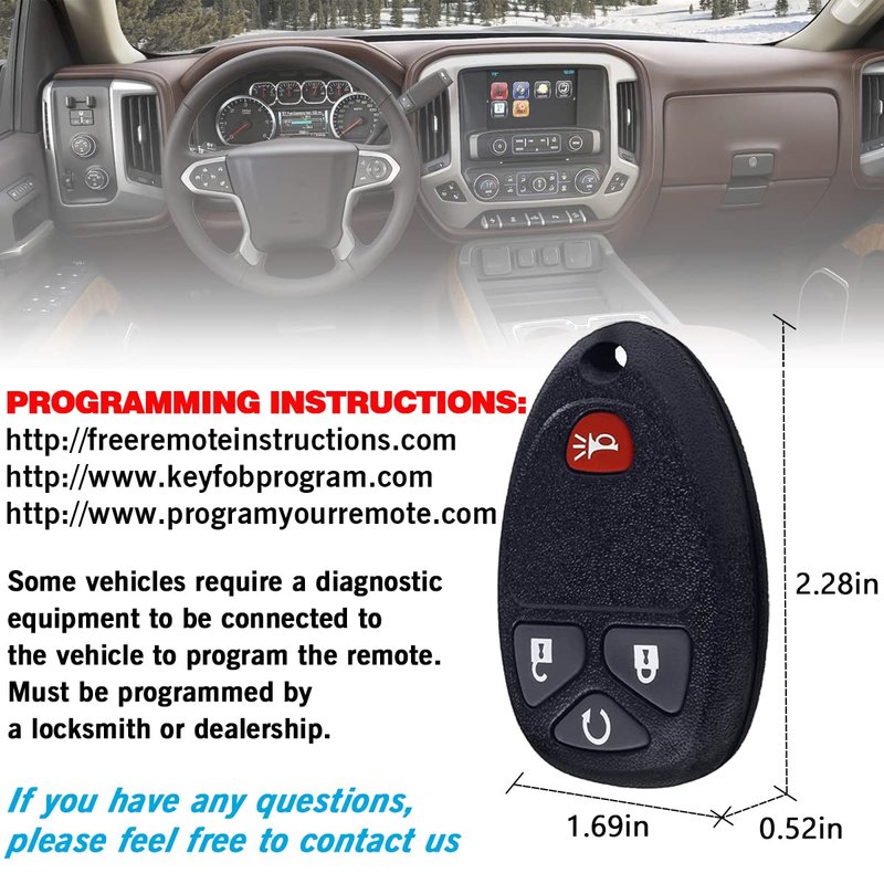 Replace your lost or broken keyless entry key fob remote.Fits P/N: OUC60270, OUC60221Buick:2008-2016 EnclaveCadillac:2007-2014 Escalade (includes ESV and EXT)2007-2008 SRXChevrolet:2007-2013 Avalanche (includes 1500 and 2500)2008-2015 Captiva Sport2007-2014 Equinox2008-2015 Express (includes 1500, 2500, 3500, 4500, Cargo, Pasajeros)2007-2013 Silverado (includes 1500, 2500, 2500 HD, 3500, 3500 HD)2007-2014 Suburban (includes 1500 and 2500)2007-2014 Tahoe2009-2016 TraverseGMC:2007-2016 Acadia2008-2015 Savana (includes 1500, 2500, 3500 and 4500)2007-2013 Sierra (includes 1500, 2500 HD, 3500 HD)2007-2014 Yukon (inlcudes XL 1500 and XL 2500)Pontiac:2007-2009 TorrentSaturn:2007-2010 Outlook2008-2010 VueSuzuki:2007-2009 XL-7Special Notes:Remote: Self-programmable2010 and newer models will require dealer/locksmith programming.Attention:Before purchasing, please go to the link provided in the 7th picture to view or go to the Youtube site to view the steps. If you can't program them yourself, you better take them to your car dealer or local technician or locksmith for activation.Important Note:If you have any question, Please feel free to contact us, we will provide you with the best solution in the shortest time.