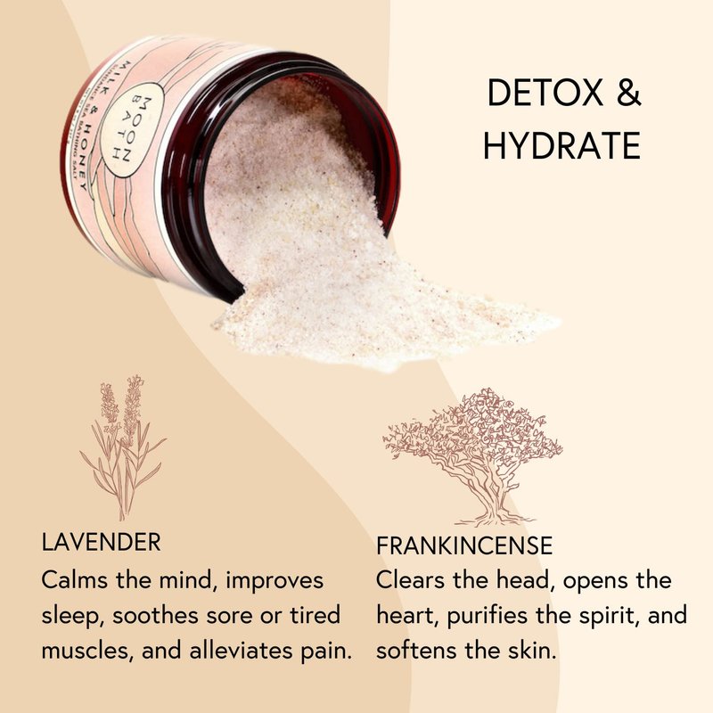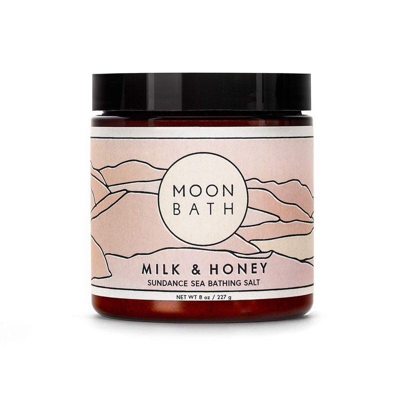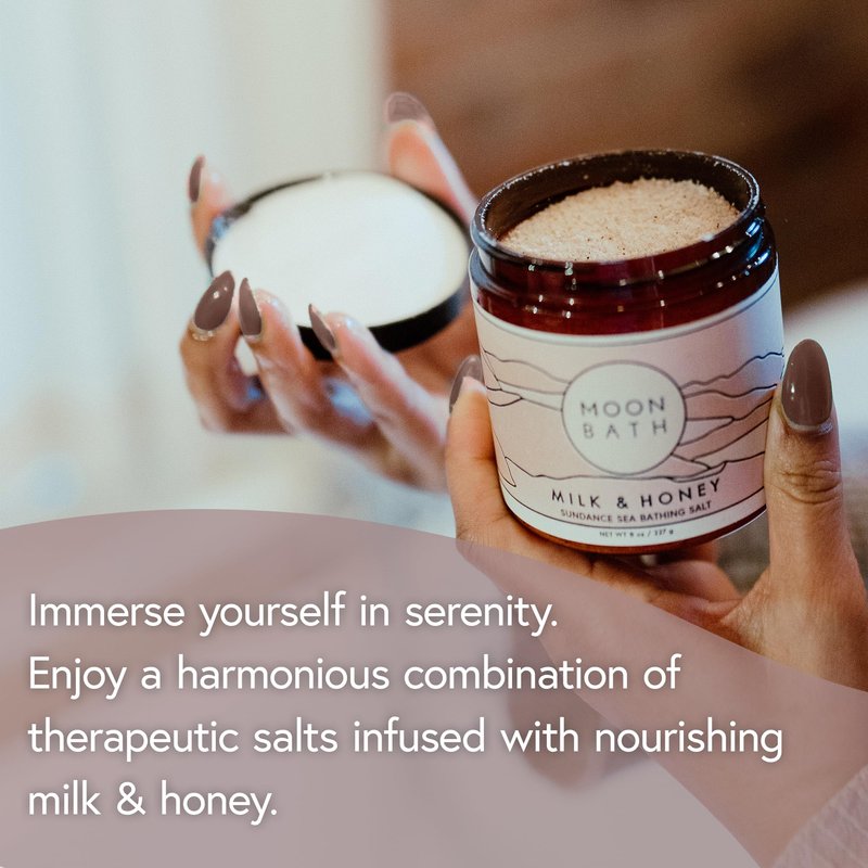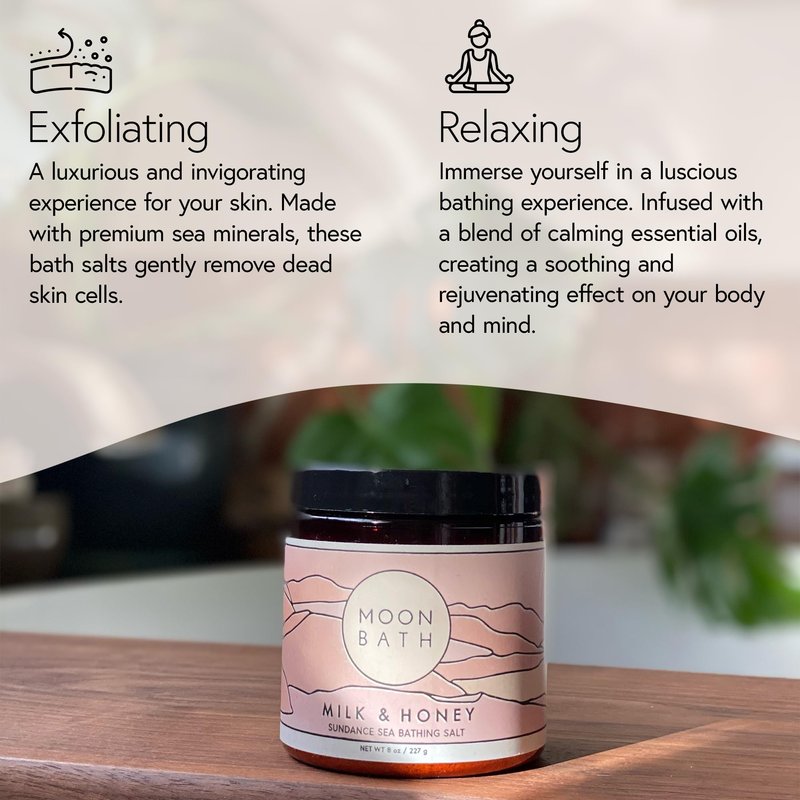 Moon Bath Milk + Honey Sundance Sea Bath Salts | Exfoliating Body Scrub & Bath Soak w/Frankincense, Bergamot & Lavender Essential Oil. Relax, Soothe Muscles, Detox | Organic Body Care, 8 oz.