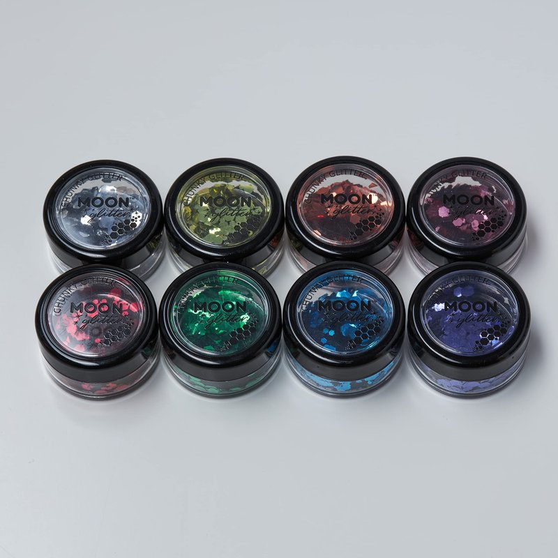 - Chunky hexagon shapes|Available in 8 colours|3g|Cosmetic grade glitter|Safe to apply to Face Body and Hair|Apply glitter with Moon Glitter Fix Gel Lip Glue Hair Glue or Nail Glue|Easily removed with just water|100% Vegan and Animal Cruelty Free.