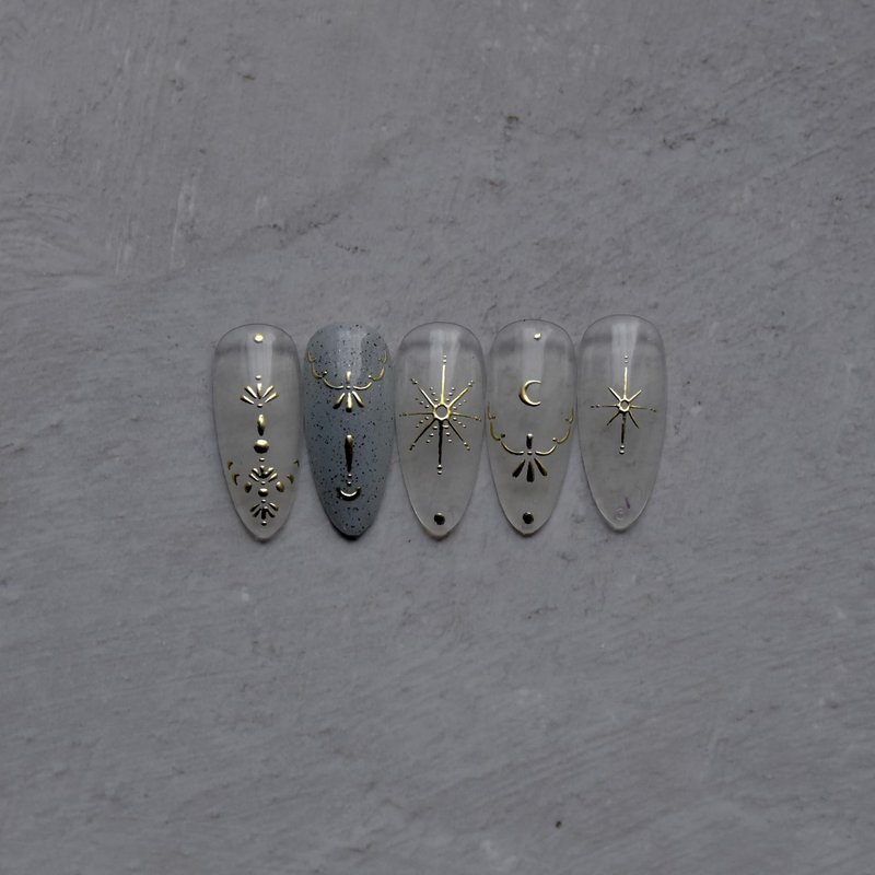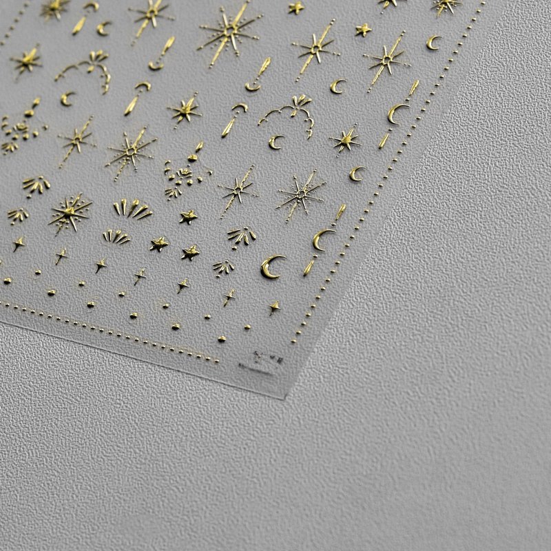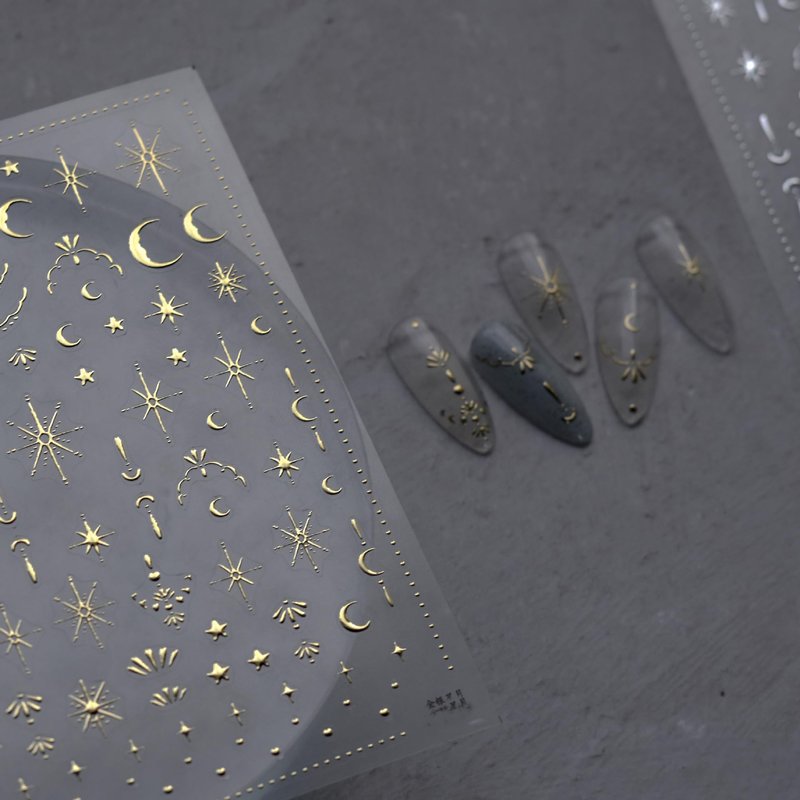 3D Gold Sun/Moon/Star Bronzing Nail Art Sticker 8*10cm Laser Star Moon Design Nail Decal Gold Silver Self-Adhesive Slider Features: Can be used for UV nails. Easy to apply on natural or artificial nails. Great to focus or filling fun in Parent-Child time. Elegant and fashionable style, easy to match any nail color. Very easy to use, suitable for professional salons and home use. Gold star moon design nail decals are very suitable for nails or nail tips. Suitable for most nails. How To Use: 1. Apply your favorite nail polish color as the base color and make it completely dry. 2. Choose the right size and desired pattern, then compare it with nails. 3. Remove the sticker with tweezers, and then press the nail sticker on the nail with a carving pen. 4. Apply a clear top coat and wait for it to dry. 5. When finished, you can design your own patterns and enjoy beautiful nails.