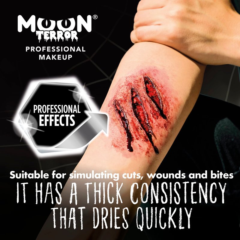 The Moon Terror Pro FX Fake Blood provides a realistic super thick consistency. Itβs quick drying on the skin, smudge proof and does not stain.