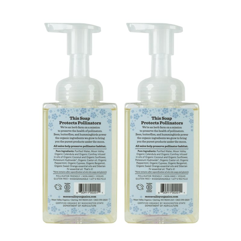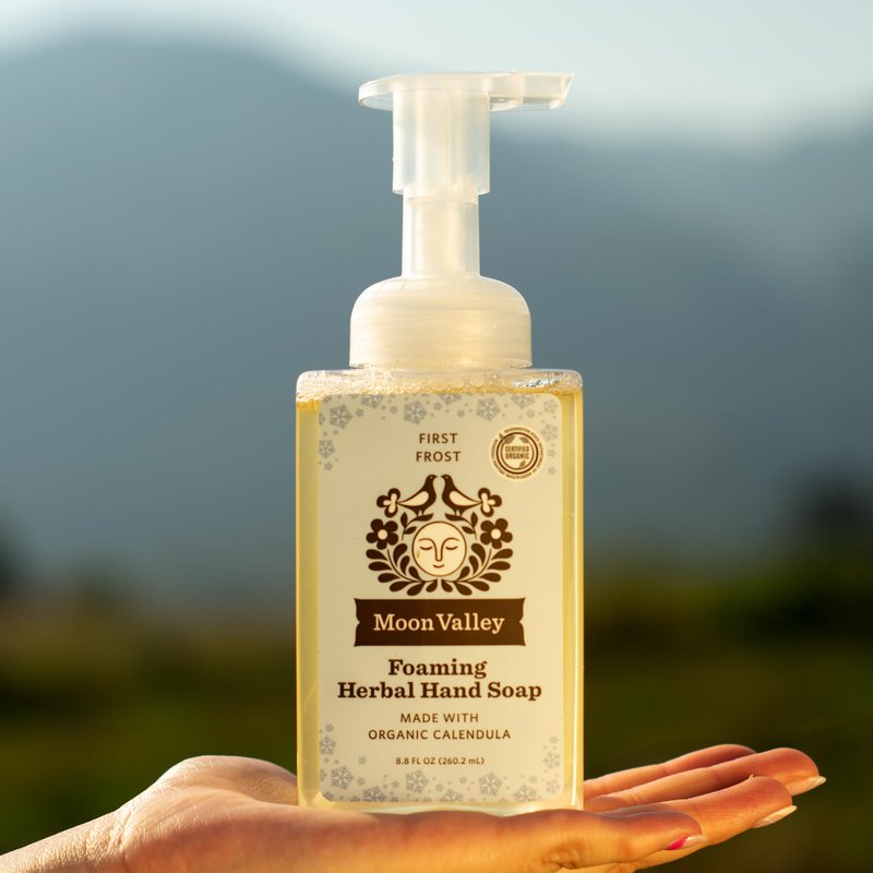 - TWO-PACK: This bundle of two 8.8oz Foaming Hand Soaps includes fresh and natural scents of First Winter Frost. Moon Valley Organics Herbal Foaming Hand Soaps are certified organic, vegan and non-gmo. Each bottle is recyclable. Ingredients leave hands soft and moisturized.