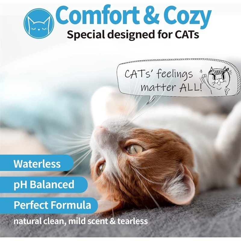 - 😸 A COMFORTABLE EXPERIANCE - Our waterless cat shampoo( or waterless shampoo) offers a Ph Balanced, neutral clean, mild scent and tearless formula, providing a comfortable and cozy experience to your cat while giving it a cat bath.