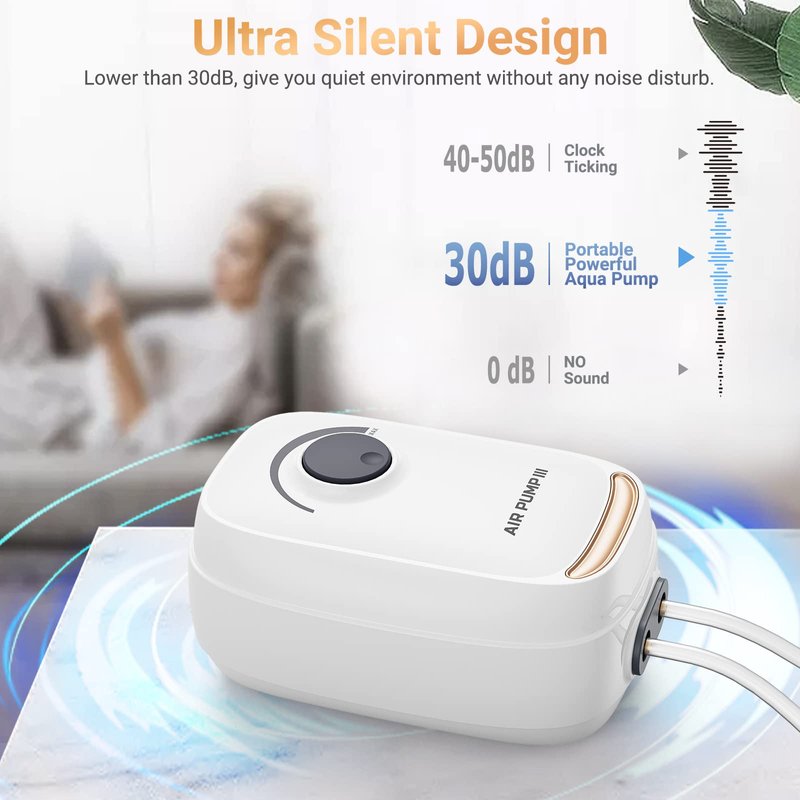- 【UPGRADE Super-Quiet Design & Energy-saving】With power 3W, the air pump is energy-efficient and won't get overheated while operating. Upgraded ABS thickening body material and four rubber feet added on the bottom make sure It produces minimum noise. It's not 100% silent but it's very Low-Decibel Designed!