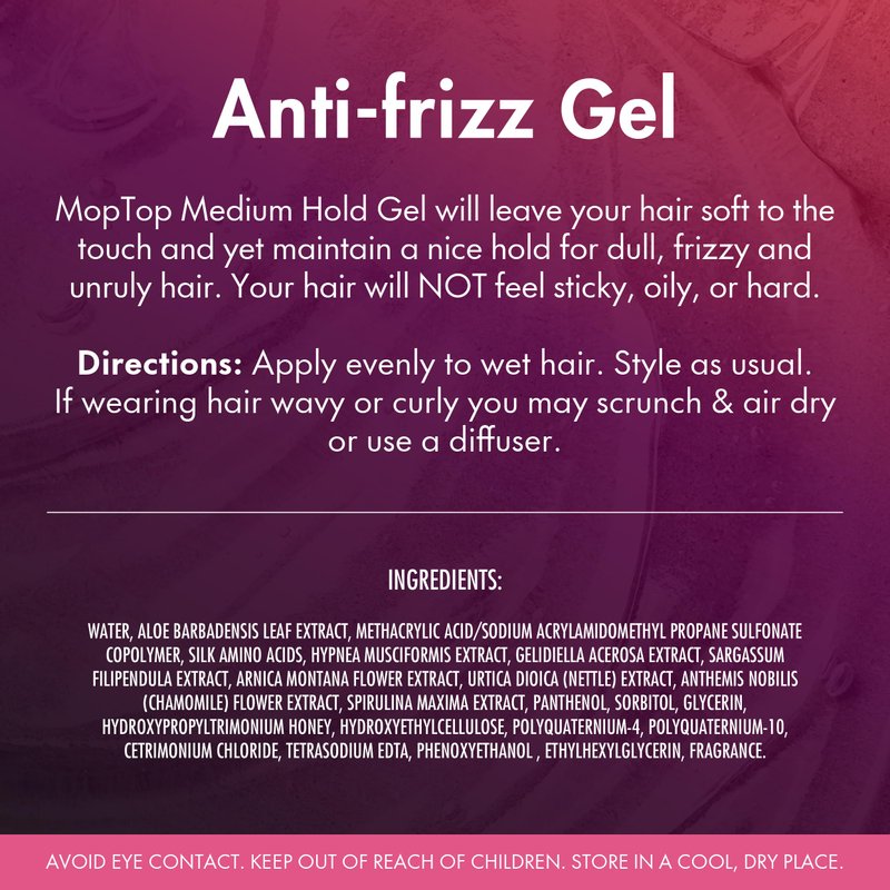 - FRIZZ-FREE AT LAST. MopTop Salon Medium Hold/Anti-Frizz Gel will moisturize and bring dry, frizzy hair back to its natural, healthy state. Maintains a soft, beautiful feel that is pleasant to the touch.