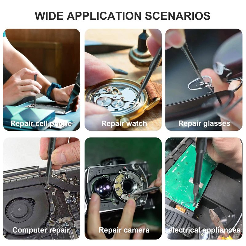 Professional Screwdriver Set can be easily repaired the most product in your daily life, such as repairing iPhone, iPad, Switch, Laptop, Computer, Cellphones, Tablet, Watch, Camera, Glasses, Printer, Drone, Game Console, Toys & Model, Home Appliances and other electronic devices.