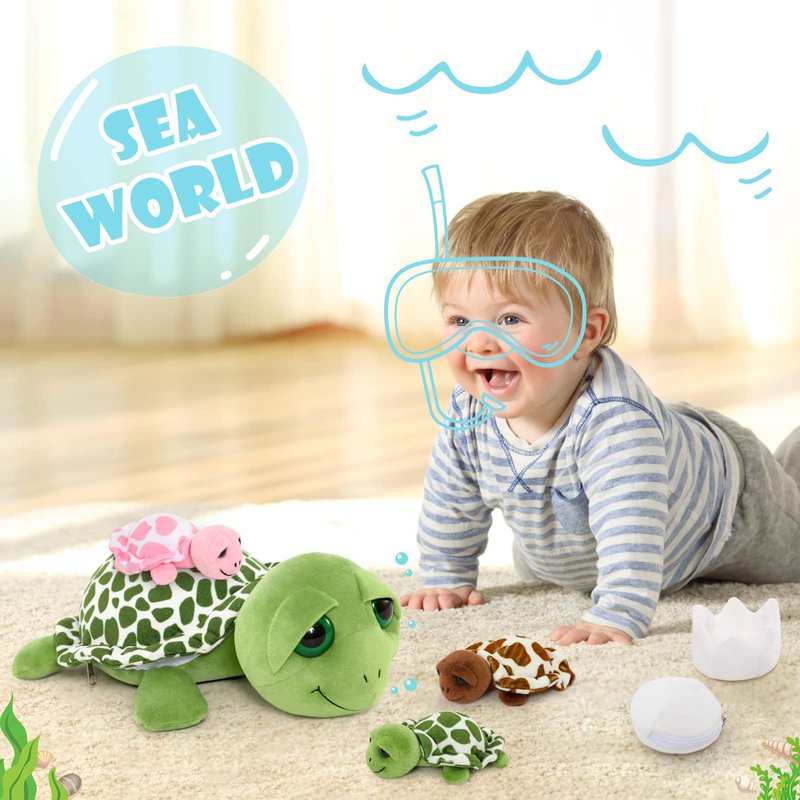 - 6-In-1 Funny Plush Toy: What An Amazing Sea Turtle Family Stuffed Animal! A green mommy sea turtle stuffed animal comes with a surprise in her zipper belly under the turtle shell, 3 baby stuffed turtle toys with 2 cute small turtle eggs. You will fall in love with these mom and baby turtle plush toys, with their big sweet eyes, kind faces, and soft fur. All "babies" fit easily into the zipper pouch, perfect for daily storage, play and carry around