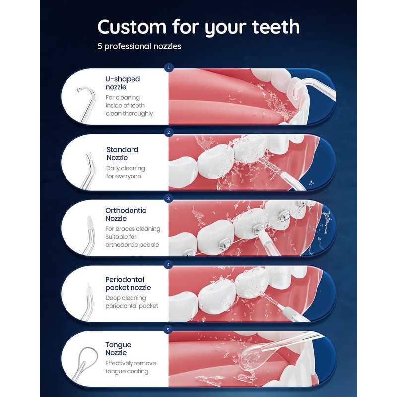 - Professional oral care: 5 water pressure settings for different tooth and gum sensitivities.