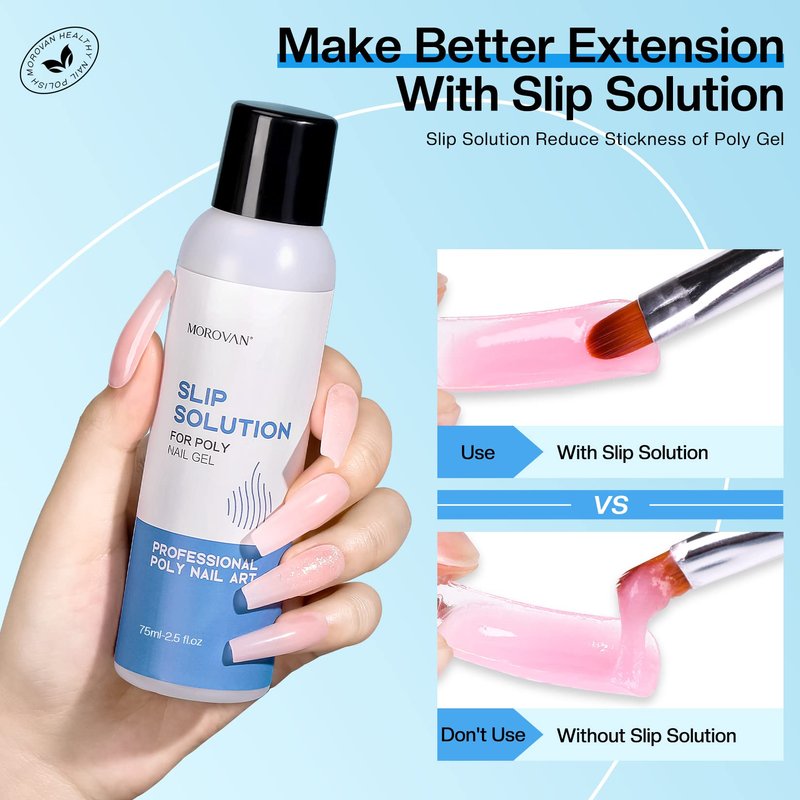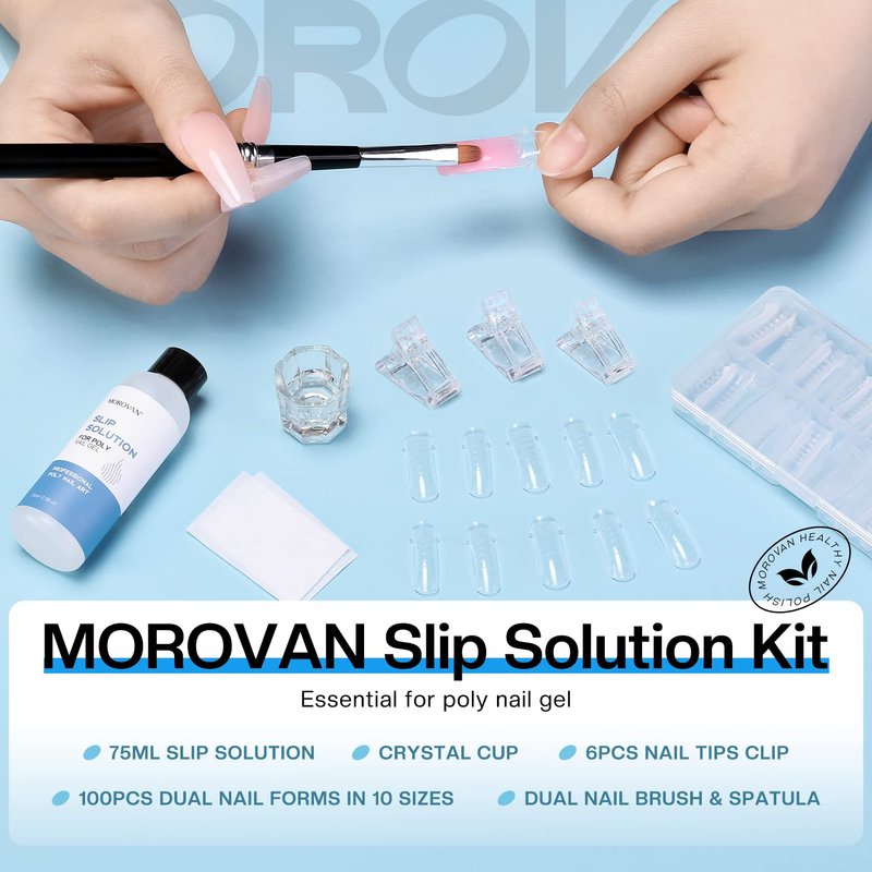 - ๐All In One Slip Solution: Morovan slip solution for poly gel nails come with brush, nail tips, nail clip, crystal cup to make it easier for you to use this nail slip solution.This poly gel slip solution is suitable for all nail types, artificial nails, UV gels nails, acrylic nails, natural nails, etc.